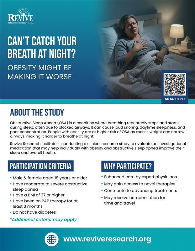 Obstructive Sleep Apnea Clinical Trials may be able to provide you with potential treatment options. Revive Research Institute is conducting Pulmonology Clinical Trials in Michigan to investigate the safety and efficacy of an investigational oral drug that may be able to help people struggling to find enough sleep because of sleep apnea.