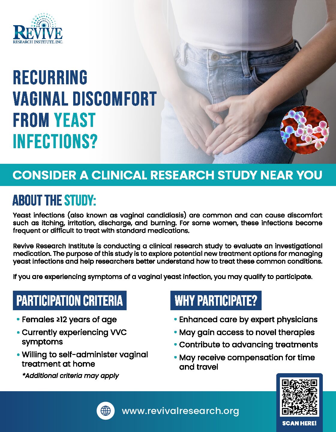 Revive Research Institute is conducting Vaginal Yeast Infection Clinical Trials in Michigan to evaluate the safety and effectiveness of an investigational medication as a potential treatment for fungal infections in the vagina.